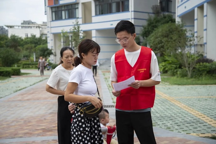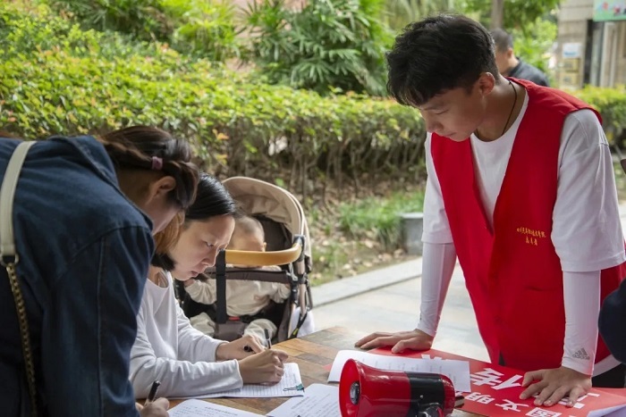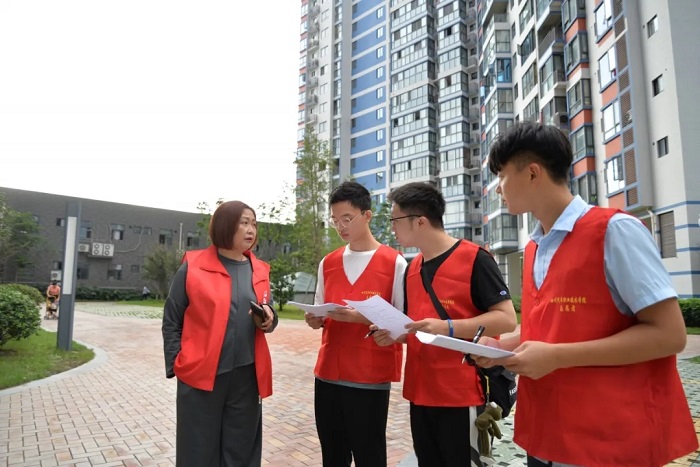 我校志愿者走進(jìn)社區(qū),為市民發(fā)放宣傳手冊、宣傳單,將一份份調(diào)查問卷送到社區(qū)居民手中并耐心釋疑,熱心解答。