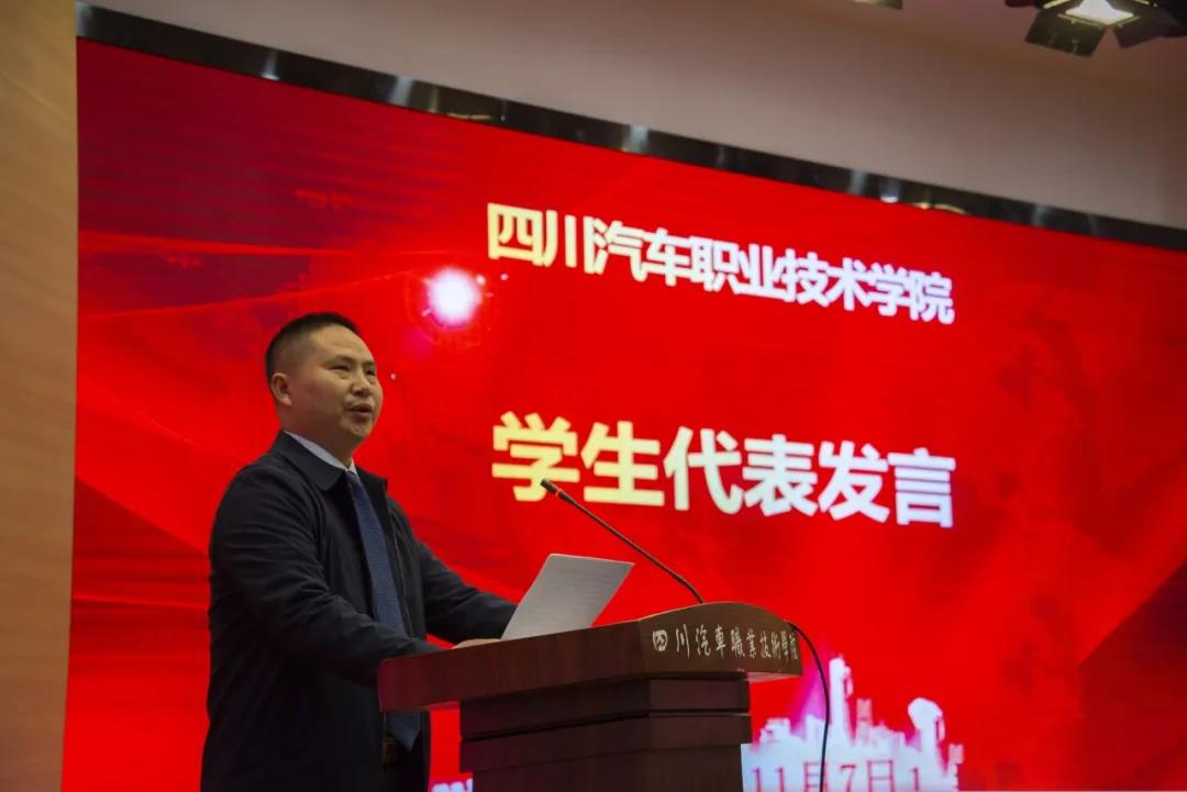學(xué)生代表趙元兵(機(jī)電工程系 械制造與自動化專業(yè))作發(fā)言。他對學(xué)院領(lǐng)導(dǎo)和老師一直以來的關(guān)心、教育和幫助表示最崇高的敬意和最誠摯的感謝。他講到,退役軍人群體大專班是四川汽車職業(yè)技術(shù)學(xué)院以鄧斌院長為代表的全體教職員工落實習(xí)近平總書記關(guān)于退役軍人工作重要論述的具體執(zhí)行,是做好退役軍人服務(wù)管理保障工作的根本遵循,對提高退役軍人的文化素質(zhì)和專業(yè)技能,推動經(jīng)濟(jì)社會發(fā)展、維護(hù)政治安全穩(wěn)定具有重要的意義。他表示,重返大學(xué)校園,學(xué)員們要秉承學(xué)院“厚德強(qiáng)技、理實交融”的校訓(xùn)精神,勤學(xué)善思,學(xué)以致用,繼續(xù)發(fā)揚軍人的優(yōu)良品格,努力成長為一名高素質(zhì)勞動者和技術(shù)技能領(lǐng)先人才。
