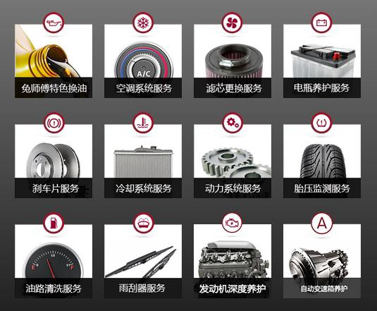 剎車系統(tǒng)養(yǎng)護(hù)、發(fā)動機(jī)深度養(yǎng)護(hù)、冷卻系統(tǒng)養(yǎng)護(hù)、自動變速箱養(yǎng)護(hù)、傳動系統(tǒng)養(yǎng)護(hù); 蓄電池更換、雨刮器更換、火花塞更換、燃油系統(tǒng)清洗等。